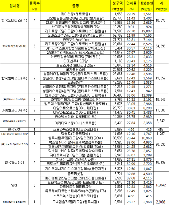 지난해 청구액 순위 상위 30개 제약사의 처방액 300순위 블록버스터 약물들의 연간 예상피해액만 5000억원에 육박하는 것으로 나타났다.
