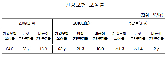 당국의 보장성 강화정책으로 건강보험 급여율은 2009년 73.5%에서 1%p 오른 74.5%로 집계됐다. 그럼에도 불구하고 전체 보장률은 2009년 64%보다 1.3%p 내려앉은 62.7%였다.