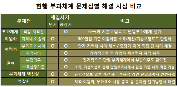 이 기준으로 볼 때 직장과 지역으로 나뉜 현재의 부과체계 현실에서 당장의 개편은 오히려 형평성을 훼손할 수 있다. 때문에 단기와 중장기 과제를 나눠 병행하면서 단일화를 추구해야 한다는 것이 연구의 요지다.