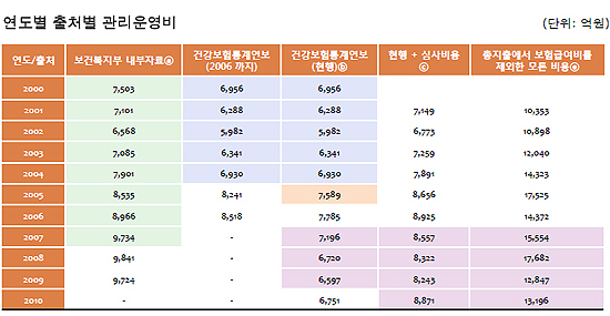 공단과 심평원이 각각 격년으로 발간하고 있는 건강보험통계연보에 따르면 통합 당시인 2000년 6956억원이었던 관리운영비는 물가상승 등에도 불구하고 11년 후인 2010년 6751억원으로 205억원 감소했다.