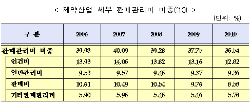 한편 국내 제약산업의 판매관리비 비중은 2007년 40.1%로 정점에 올랐다가 2010년에는 36.5%로 줄고 있지만 여전히 제조업 평균 11.2%에 비해 3배 이상 높았다.