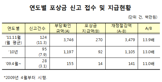 적발 금액은 지급 포상금 2억6994만원의 13.9배 수준으로, 신고 건이 지속적으로 늘어 신고액이 37억4609만원에 이르는 것으로 나타났다.