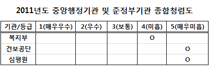 복지부는 외부청렴도에서 보통 수준인 3등급을, 내부청렴도에서는 미흡 수준인 4등급 평가를 받은 것으로 나타나 보통 수준 이하였다.