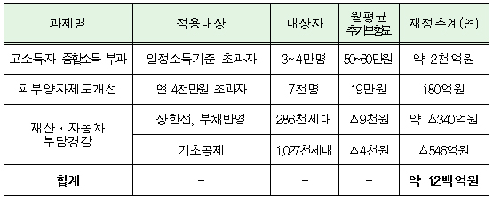 고소득자 종합소득 부과에서는 약 2천억원, 피부양제제도 개선에서는 180억원 등의 재원이 추가 확보되고, 재산.자동차 부담경감에서는 886억원이 줄어든다.