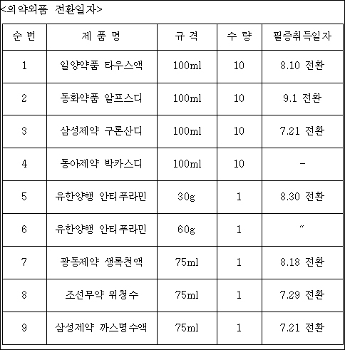 윤 의원실 관계자에 따르면 외품전환 품목 중 드링크류의 의약외품신고필증 취득 날짜는 타우스액 8월10일, 알프스디 9월1일, 구론산디 7월21일, 안티푸라민 8월30일, 생론천액 8월18일, 위청수 7월29일, 까스명수액 7월21일 등으로 제각각이었다.
