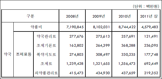 이 중 약품비는 4조5794억8300만원(76%), 조제행위료는 1조4471억3500만원(24%)이었다.