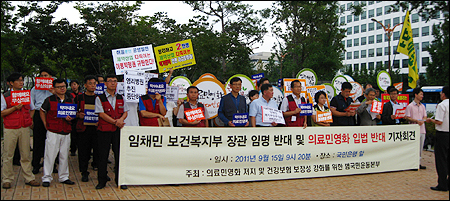 "경제관료인 임채민 씨의 복지부장관 임명은 의료민영화를 추진하기 위한 이명박 정권의 마지막 발악이다."
