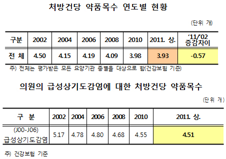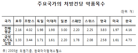 이는 감기 등 급성상기도감염과 같은 비교적 가벼운 급성기 질환에 대한 약품목 수가 4.51개로, 2~3개 수준에 불과한 다른 주요 국가와 비교해 여전히 개선점이 필요하다는 것을 시사한다.