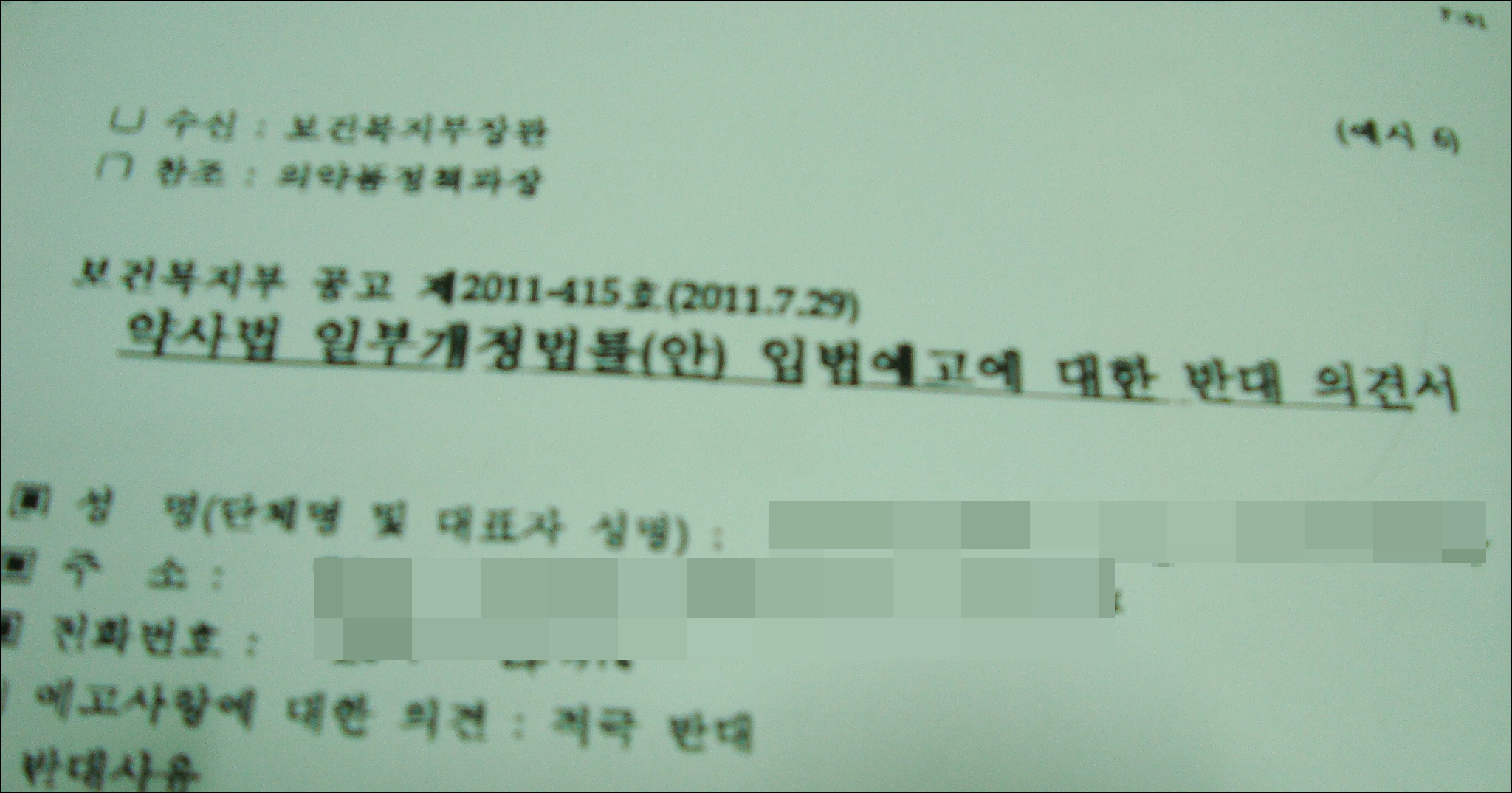 실제 이 의견서들은 '보건복지부 공고 제2011-415호(2011.7.29) 약사법 일부개정법률(안) 입법예고에 대한 반대의견서'라는 제목으로 성명, 주소, 전화번호, 예고사항에 대한 의견: 적극 반대, 반대사유 등의 순으로 문서서식이 동일하다.