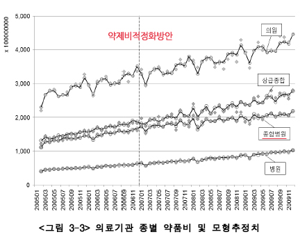 분석에 따르면 2005년부터 2009년까지의 월별 전체 약품비는 선형적으로 증가했다. 전체 약품비는 2005년 1월 5771억원에서 매달 평균 79억7000만원씩 늘었다.