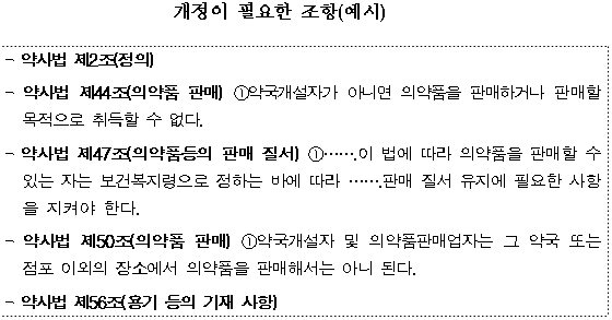 심야나 공휴일 시간대 의약품 구입불편 해소라는 대원칙에 맞춰 약국 외 판매대상 의약품과 구체적인 취급장소, 유통관리 기준 등은 하위법령인 약사법시행규칙과 고시 등에 명시된다.
