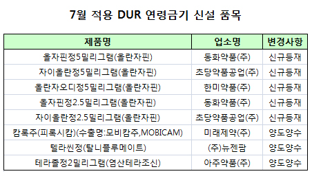 건강보험심사평가원은 지난달 말 식품의약품안전청의 병용·연령금기 성분 추가 공고에 이어 DUR 점검에 따른 7월 병용·연령금기 추가 품목을 4일 공개했다.