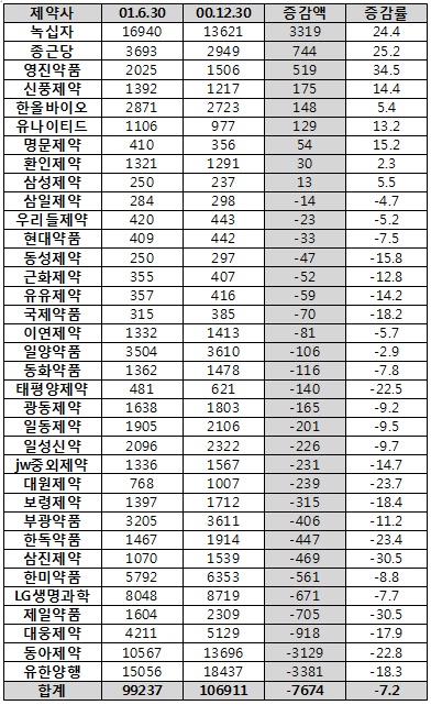 대장주였던 유한양행은 6개월 간 시가총액이 3381억원이나 감소했으며, 동아제약 3129억원, 대웅제약 918억원 등이 줄었다.