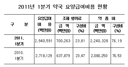 약품 구성비는 최근의 기조를 반증하듯 지속적인 감소세를 보이고 있다. 지난해 1분기 76.53%를 차지하던 약국 약품비는 올 1분기 76.19%으로 0.34% 줄었다.