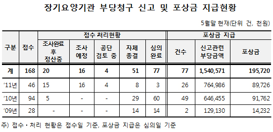 한편 노인장기요양보험제도 시행 이후 장기요양기관의 난립과 기관 간 경쟁으로 불법·부당청구가 갈수록 증가해 이에 따른 신고 건과 포상금도 증가하고 있는 추세다.