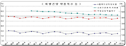 소화기관용약 처방률과 투약일당 약품비는 각각 줄었다. 소화기관용약 처방률은 전년 동기 대비 1.01%p 감소한 51.99%로 나타났으며 투약일당 약품비는 7원 감소한 1935원으로 집계됐다.