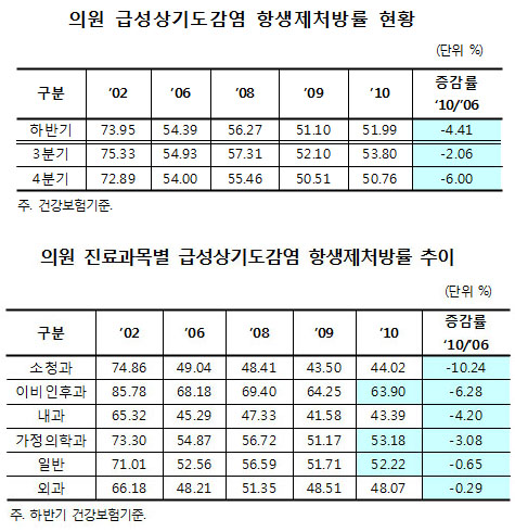2010년 하반기 약제급여적정성평가 결과 평가대상 기관 중 점유율이 높은 의원의 감기 질환 항생제 처방률은 51.99%로 2006년 54.39%에 비해 4.41% 감소했다.