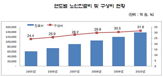 노인 진료비 또한 2005년 전체 24.4%에 해당하는 6조556억원에서 2008년 들어 29.9%에 해당하는 10조4904억원으로 폭증했으며 지난해인 2010년에는 31.6%를 돌파, 13조7847억원을 기록했다.