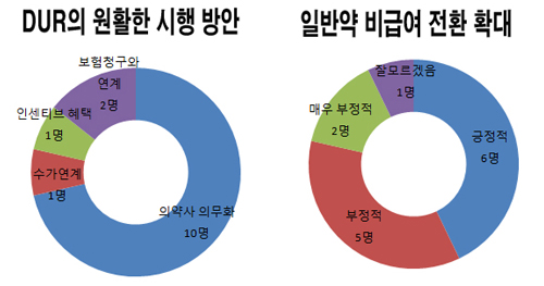 실제로 설문조사에 참여한 의원 14명 가운데 DUR의 원활한 시행을 위해 의무화가 필요하다는 응답은 72%인 10명에 이른 반면 인센티브 제공, 수가연계 등 보상강화가 필요하다는 응답은 각각 1명에 그쳤다.