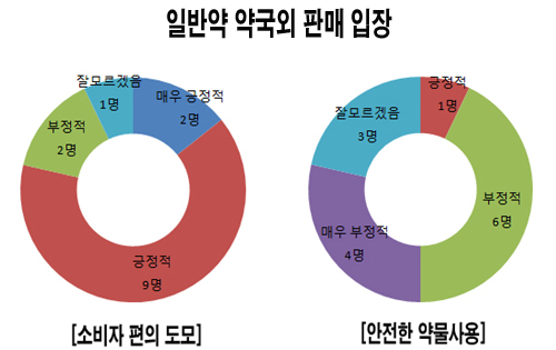 일반약 약국외 판매가 소비자 편의를 도모할 수 있느냐에 질문에 긍정적이라는 응답은 11명(매우 긍정적 2명 포함)인데 반해 안전한 약물사용, 의약품 안전관리 측면에서는 부정적이라는 응답(매우 부정적 포함)이 각각 10명, 11명으로 조사됐기 때문이다.
