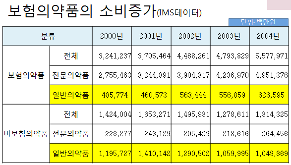 이로 인해 보험의약품 소비는 갈수록 증가하고 있지만 비보험권에 있는 일반약은 사용량이 지속적으로 증가하고 있다는 것이 신 교수의 설명이다(표 참조).
