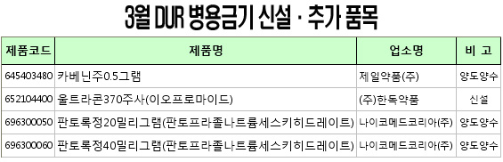 건강보험심사평가원(원장 강윤구)은 '3월 약제급여목록 및 급여상한금액표'와 DUR 점검에 따른 병용·연령금기 추가 품목을 3일 공개했다.