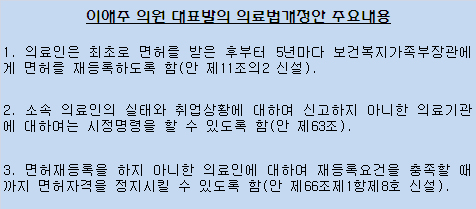 한편 이애주 의원의 의료인 면허재등록 의무화 법안은 오는 4일 국회 보건복지위원회에 상정된다.