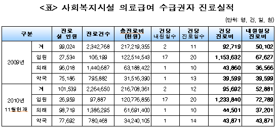 특히 지난해 진료받은 사회복지시설 의료급여 수급권자 인원이 10만1539명에 달하고, 총 진료비도 2167억원이나 되는 등 전년대비 건당진료비와 내원일당 진료비가 높아져 사후관리가 요구되고 있다고 복지부는 설명했다.