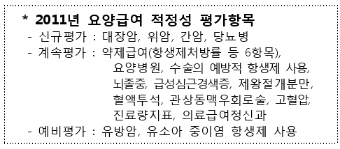건강보험심사평가원(원장 강윤구)은 11일부터 이 같은 내용의 '2011년도 요양급여 적정성평가 계획'을 홈페이지를 통해 공개한다고 밝혔다.