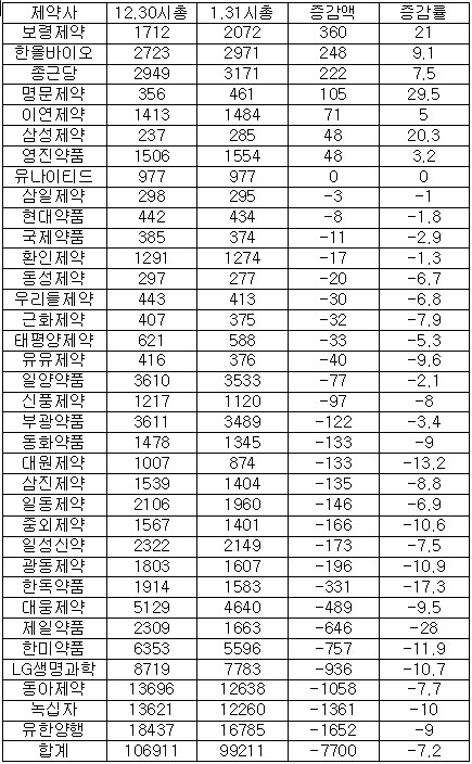 또 전체 제약사 시가 총액 합계는 10조 6991억원에서 9조 9211억원으로 7700억원 줄었다.