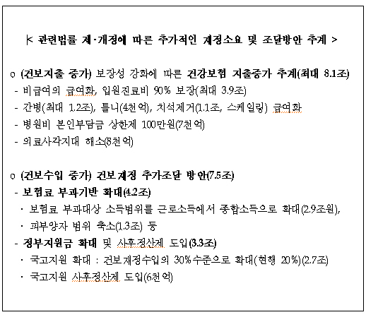 정책위원회는 이 같은 내용의 보장성 강화 및 소요재원 추가조달을 위해 19건의 제.개정 법률을 추진키로 했다.