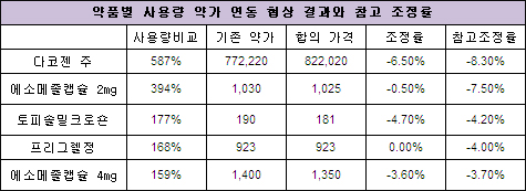 ‘에소메졸’ 또한 건강보험공단과의 사용량-약가연동 협상에서는 0.5%만을 조정했지만 산식대로라면 최소 7%를 떨어뜨리는 것이 합당하다는 게 이들 단체의 주장이다.