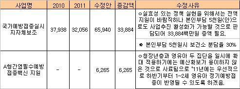 A형간염 필수예방접종 백신지원 예산도 삭감됐다가 62억6500만원이 원상 회복됐다.