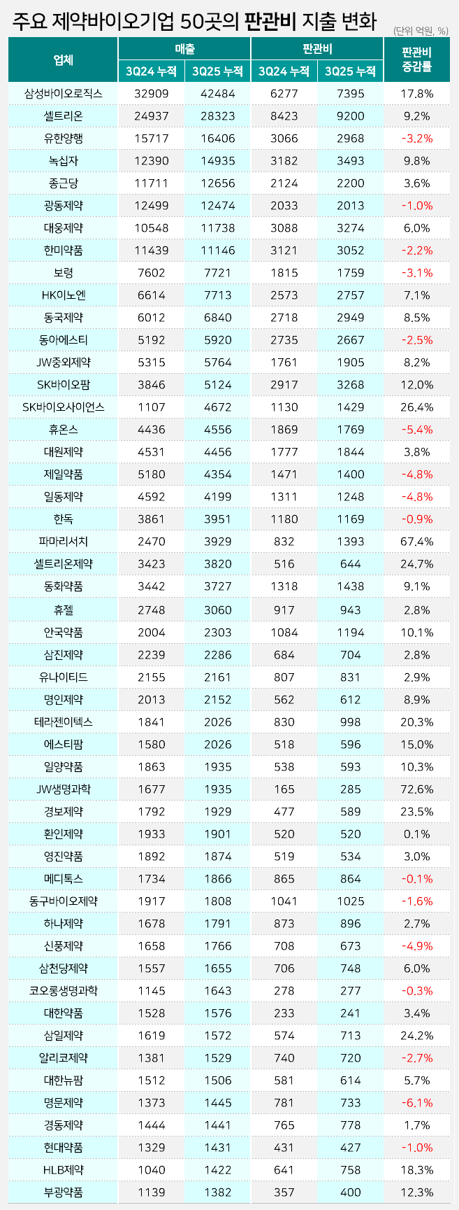 주요 상장 제약 50곳 중 36곳, 3분기 누적 판관비 지출 확대