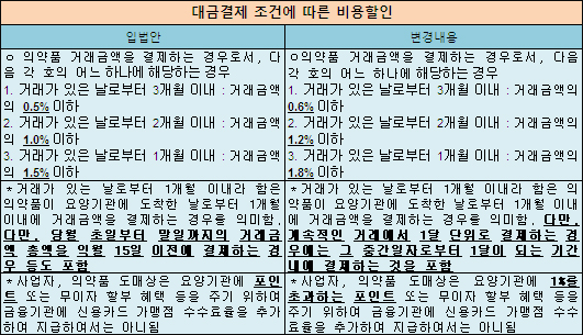 한편 보건복지부는 최근 입법예고안보다 인상된 당월 결제 1.8%, 두달 결제 1.2%, 석달 결제 0.6%에 카드 마일리지 1% 안을 규제개혁위원회에 제출한 바 있다.