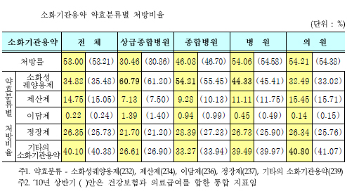 약효분류별 처방비율로 보면 기타 소화기관용약이 40.10%, 소화성궤양용제 34.82%, 정장제 26.35%, 제산제 14.75% 순이었다.