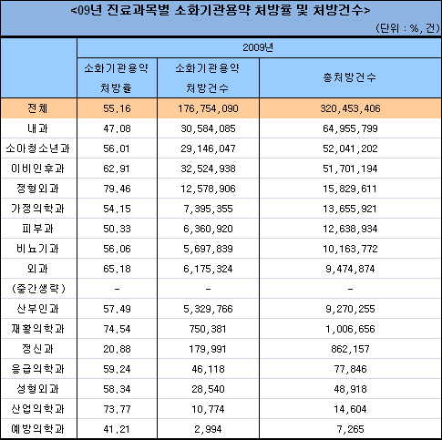 반면 처방건수 대비 소화기계약 처방률은 정형외과 79.46%, 재활의학과 74.54%, 산업의학과 73.77%, 외과 65.18% 등으로 이비인후과 62.91%, 소아청소년과 56.01%, 내과 47.08%보다 더 높았다.