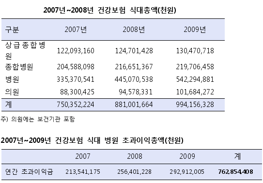 또한 전체 병원의 식비 총액인 2007년 7504억원, 2008년도 8810억원을 기준으로 살펴보면 2007~2009년 3년 간 전체 병원에 초과이익이 발생했고 이로 인해 7629억이 불필요하게 추가부담 된 것으로 나왔다.
