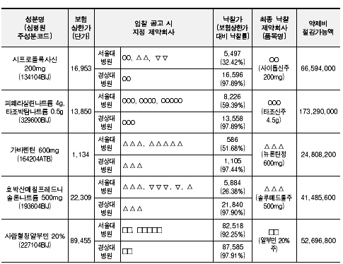 이 같은 결과는 낙찰가격에 그대로 영향을 미쳤다. 보험상한가가 1만6953원인 사프로플록사신200mg을 서울대병원 5497원(낙찰률 32.42%)에 구매한 반면, 경상대병원은 1만6596원(97.89%)에 샀다.