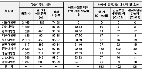 감사원은 2009년도 의약품 총구매예정금액 대비 낙찰률이 병원별로 최대 24.31% 차이가 나는 등 10개 국립대병원이 모두 형식상 경쟁입찰방식으로 원내사용약을 구매하고 있었지만 절감효과에서는 큰 차이가 있었다고 지적했다.