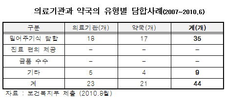 13일 분석자료에 따르면 복지부에 보고된 의료기관과 약국의 담합 건수는 2007년 16건을 기록했으며 2008년에 12건, 2009년 11건을 기록하다가 2010년 들어 5건이 보고됐다.