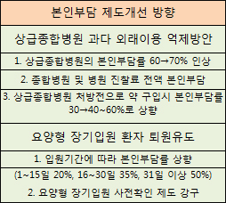 아울러 요양형 장기입원 환자의 퇴원을 유도하기 위해 입원기간에 따라 본인부담률을 차등화한다. 부담률을 현행 20%에서 1~15일 20%, 16~30일 35%, 31일 이상 50%로 확대하는 방안이다.