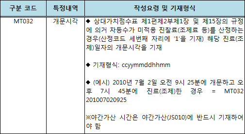 ◆약국 근무시간 어떻게 확인하나?= 일선 요양기관의 근무시간은 새롭게 신설된 명일련단위 특정내역 '개문시각'(MT032)을 기재하는 것으로 확인이 가능하다.