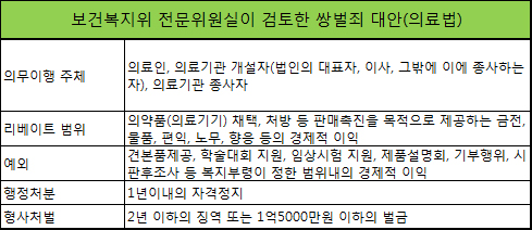 리베이트를 받은 의약사 등에게 2년 이하의 징역 또는 1억5000만원 이하의 벌금의 형사처벌과 자격정지 1년의 행정처분을 병과하는 것이 주된 내용이다.