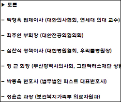 23일 민주당 전현희 의원실에 따르면 24일 전 의원 주관으로 국회에서 열리는 '안정적인 진료환경 조성을 위한 입법공청회'에 패널은 복지부와 법무법인을 제외하면 모두 의료계 인사로 채워졌다.