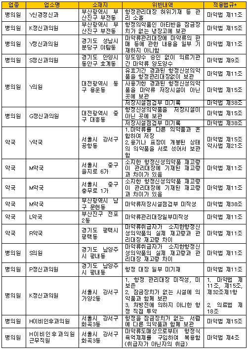 또한 부산 부산진구 D의원은 향정약인 아티반을 잠금장치가 없는 냉장고에 보관했고 서울 강서구 E의원은 처방전을 발행하지 않고 향정약 직접 투약한 혐의를 받고 있다.