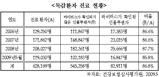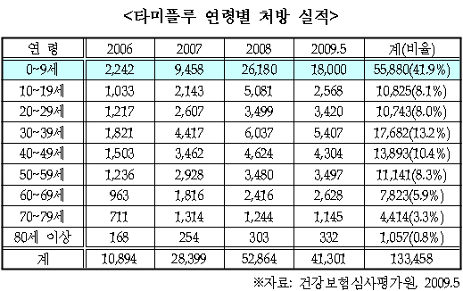독감환자 대비 타미플루 처방비율을 분석한 결과, 2006년도 8.4%에서 2007년도 16.5%, 2008년도 25.4%, 2009년도(5월까지) 34.7%로 해마다 급증하는 것으로 드러났다. 독감환자 10명 중 3명 이상이 타미플루를 복용하고 있는 것이다.