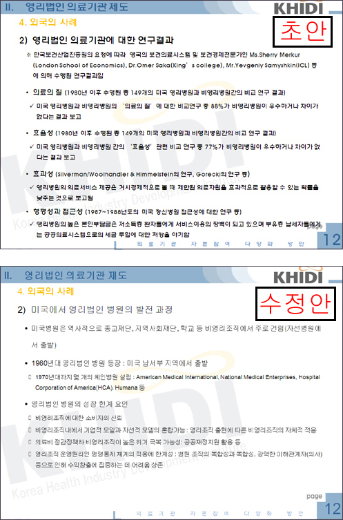 당시 토론자로 나선 건강세상네트워크 김창보 소장은 비영리병원의 우수성이 나타난 연구용역 결과가 발제문 초안에는 있었으나 최종본에는 삭제된 점을 지적했다. 발제문 초안에 따르면 진흥원이 영국 보건의료시스템 및 보건경제전문가인 Sherry Merkur 등에게 맡긴 연구용역 결과가 포함됐다.