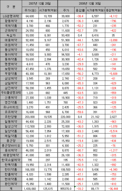 올 한해 경기침체 장기화로 인해 주식 시장이 극심한 부진을 겪은 가운데 제약주도 시가총액의 30%가 감소하며 최악의 한 해를 보냈다.