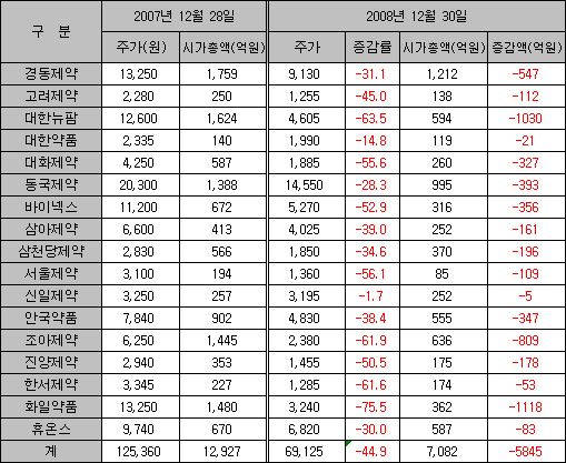 대한뉴팜, 대화제약, 바이넥스, 서울제약, 조아제약, 진양제약, 한서제약 등은 주가가 지난해 말보다 절반 이하로 떨어졌다.